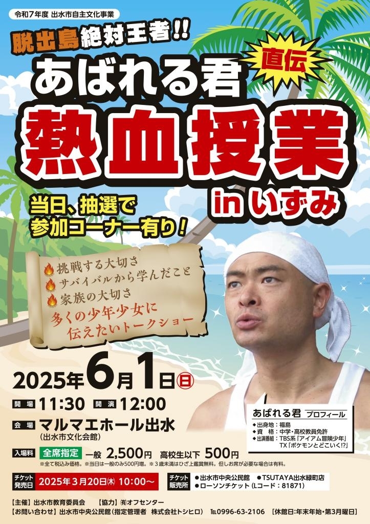 チケットは出水市中央公民館窓口、TSUTAYA出水緑町店、ローソンチケット(Lコード:81871)